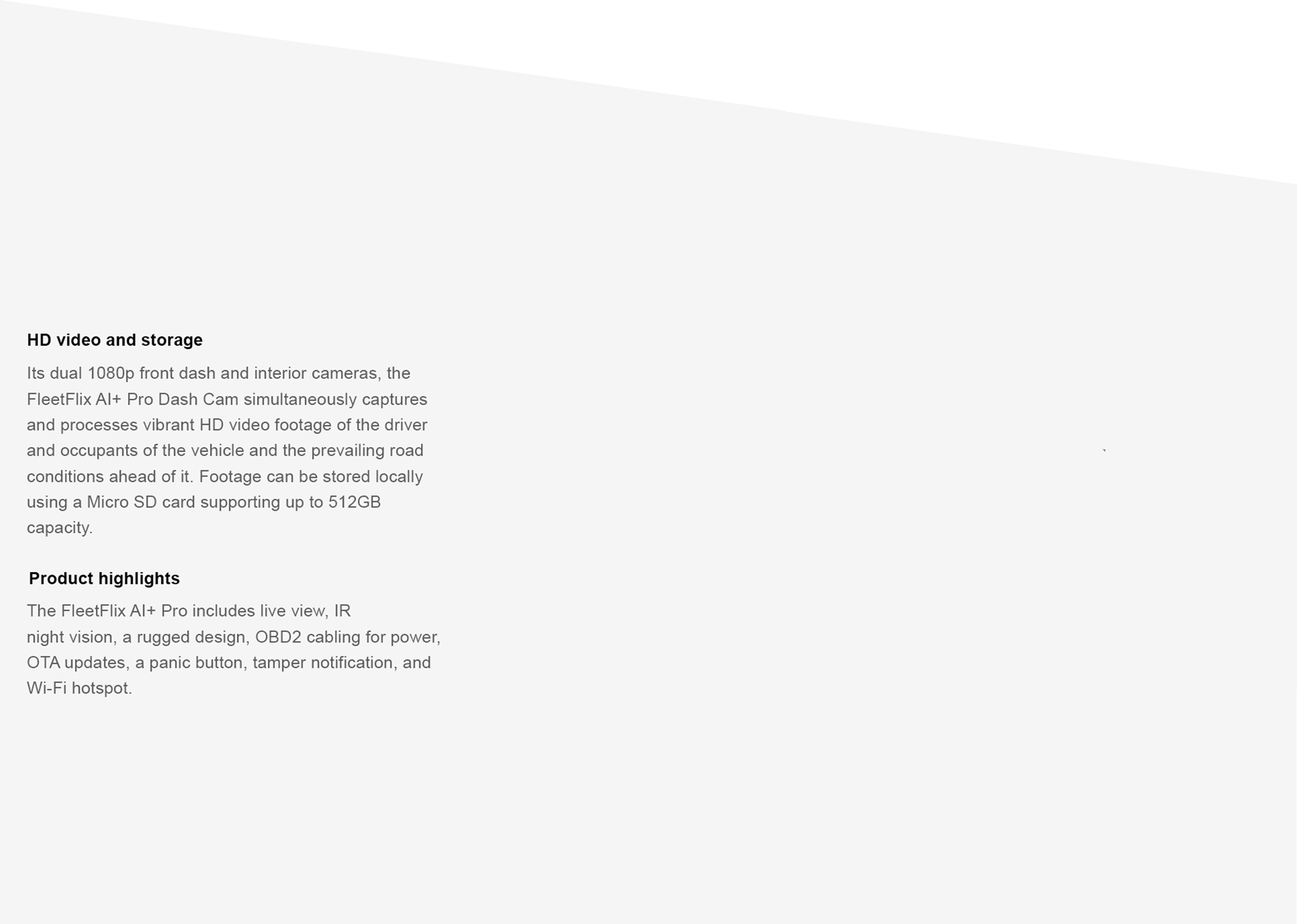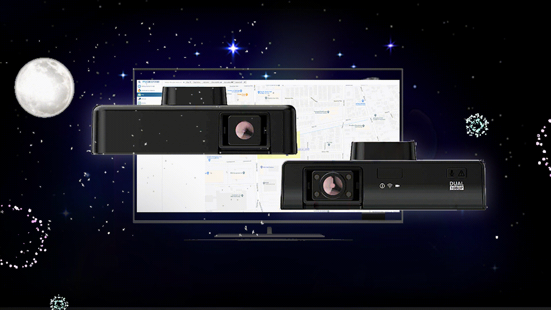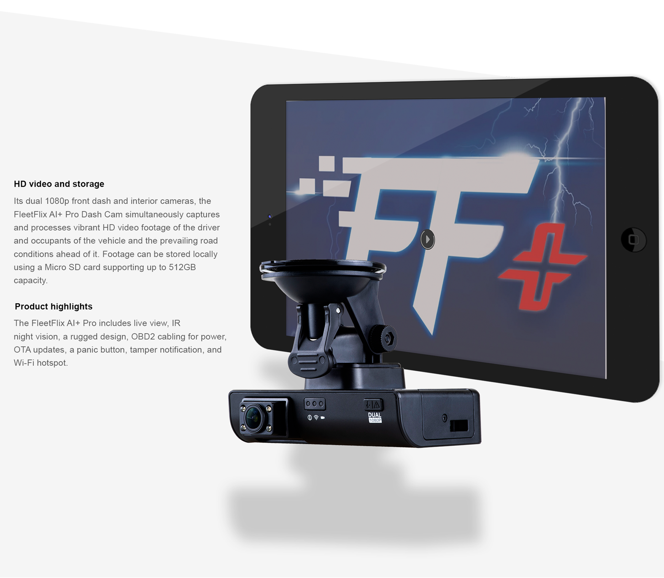 Dual 1080p cameras (front and rear).Live stream, Dual IR, Forward CollisionWarning, Lane Departure Warning,CAN bus capabilities, Distracting Driving,and Wi-Fi.